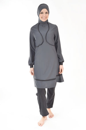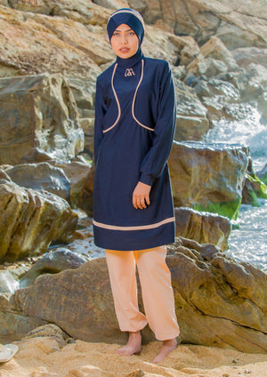 Le Maillots de bain Kenza est composé de deux pièces: Un haut avec bonnet amovible intégré, deux attaches sont visible de l'intérieur du maillot qui se relient au pantalon. Le pantalon est constitué de deux attaches au niveau des chevilles afin qu'il soit ajustable  pour plus de confort et de cordon de serrage aux niveau de la ceinture.